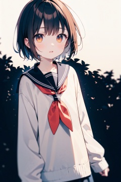 solo, 1girl, sleeves past wrists,sleeves past fingers,bangs, hair ornament, serafuku, white background, short hair, parted lips,long sleeves, muted color, neckerchief, brown hair, sailor collar,blunt bangs, cowboy shot, orange eyes, black sailor collar, looking at viewer,,(lake:1.2),(starry sky:1.2),