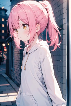 (best quality), ((masterpiece)), (highres),standing,original, extremely detailed wallpaper, (an extremely delicate and beautiful),(loli),(petite),loose clothes,Pink hair,Yellow eyes,high ponytail,hair flower,fipped hair,floating hair,(solo),street,city,focused,solo