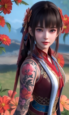 (,1girl, ,best quality, ),looking at viewer, <lora:399-DA-少年歌行-华锦:0.8> ,,ultra detailed background,ultra detailed background,ultra realistic 8k cg,, ,masterpiece, (( , )),ultra realistic 8k cgSurrounded by strange, movie perspective, advertising style, Colorful background, splash of color A beautiful woman with delicate facial features,tattoo all over body, flower arms,