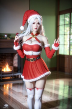 belt,christmas,red dress,fingerless gloves,santa costume,striped thighhighs,looking at viewer,pov,(full body:1.2),(the background should be in the warm:1.6),