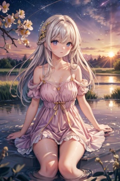 {{{masterpiece}}}, {{best quality}}, {{super fine illustration}}, {{beautiful and delicate water}}, {{beautiful and detailed eyes}, {very detailed light}, {perfect and delicate limbs}, {nature}, {painting}, {water bloom}, {delicate glow}, {{very fine 8KCG wallpaper}}, lavender eyes, peach pink pupils, whole body, white hair, luminous eyes, an extremely delicate and beautiful girl, (1 girl), medium chest circumference, dynamic angle, (Violet dress with gold decoration), (long hair floating everywhere), (beautiful hair decoration), (delicate wet dress), (nsfw), (breeze), long hair blown up, ((messy hair style)), (long bangs between eyes), wrinkled skirt, Flowers meadow, near the water edge, (((sunset)), (less stars form a circle), randomly distributed clouds, (rivers), (willows with branches falling into the water)
