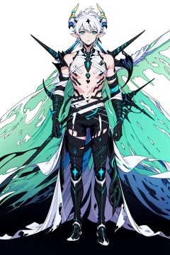 (masterpiece:1.3),(the best quality:1.2),(super fine illustrations:1.2),(Masterpiece),high quality,high detail,(white background:1.2),looking at viewer,(SOLO:1.4),outline,simple background,fullbody,, pattern on hair,elbow gloves,jewelry,gauntlets,white hair,spear,holding polearm,pauldrons,shoulder armor,dragon tail,demon tail,demon horns,demon boy,polearm,holding sword,blue eyes,ahoge,face,armor,tail,blue horns,holding weapon,gloves,torn pants,torn clothes,torn bodysuit,torn,pectorals,dragon wings,demon wings,thick eyebrows,pointy ears,male focus,muscular,horns,bare shoulders,1boy,blue eyes,