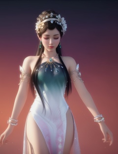 ultra realistic 8k cg, picture-perfect face, flawless, clean, masterpiece, professional artwork, famous artwork, cinematic lighting, cinematic bloom, perfect face, beautiful face, fantasy, dreamlike, unreal, science fiction,  beautiful clothes, lace, lace trim, lace-trimmed legwear,  (rich:1.4), prestige, luxury, jewelry, diamond, gold, pearl, gem, sapphire, ruby, emerald, intricate detail, delicate pattern, charming, alluring, seductive, erotic, enchanting, hair ornament, necklace, earrings, bracelet, armlet,halo((,1girl, pov,))(((,  1girl,  solo,looking at viewer, ))),(((1girl, solo, dress, white_dress, black_hair, 3d, gradient_background, gradient, jewelry)))<lora:DA_WhiteSnakeGreenSnake:0.8>