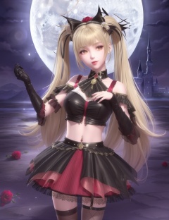 ultra realistic 8k cg, picture-perfect face, flawless, clean, masterpiece, professional artwork, famous artwork, cinematic lighting, cinematic bloom, perfect face, beautiful face, fantasy, dreamlike, unreal, science fiction , beautiful clothes, lace, lace trim, lace-trimmed legwear, (rich:1.4), prestige, luxury, jewelry, diamond, gold, pearl, gem, sapphire, ruby, emerald, intricate detail, delicate pattern, charming, alluring, seductive, erotic, enchanting, hair ornament, necklace, earrings, bracelet, armlet,halo((,1girl, pov,)) (((,, multiple_girls, 2girls, flower, rose,, multicolored_hair, , midriff, twintails, skirt, large breasts, looking at viewer, ))) <lora:DA_ChloeNightWings:0.6>(((full_moon, , night, 2girls, moonlight, red_moon, solo, night_sky, sun, castle, long_hair, jewelry, twintails, skirt, blonde_hair, thighhighs, bat)))