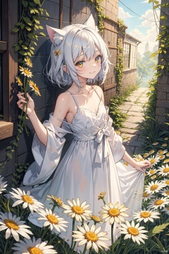 yellow theme,the setting sun,(((Chamomile))),Chamomile,cornflower,vines,forest,ruins,lens flare,hdr,Tyndall effect,damp,wet,1girl,bare shoulders,broken glass,broken wall,white hair,white dress,closed mouth,constel lation,flat color,braid,blinking,white robe,float,closed mouth,constel lation,flat color,looking up,standing,medium hair,standing,solo,((catgirl))