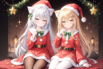 multiple_girls,2girls,animal_ears,santa_hat,christmas,cat_ears,long_hair,cat_tail,hat,tail,sleeves_past_wrists,fur-trimmed_headwear,green_eyes,very_long_hair,pom_pom_\(clothes\),blurry,smile,belt,bell,blush,depth_of_field,cat_girl,blurry_background,hair_ornament,santa_costume,holly,bangs,one_eye_closed,hair_between_eyes,fur_trim, white pantyhose