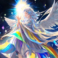 mty,masterpiece,best quality,realistic,HDR,UHD,8K,Professional, 1girl, , liuli2, chromatic dispersion, coloured glaze, Polychromatic prism effect, rainbowcore, iridescence/opalescence, see-through, plastic, glowing colors, (sunlight),(angel),dynamic angle, floating, halo, floating white silk,(Holy Light),silver stars, Glowing ambiance,enchanting radiance, holy light, brilliance, sheen, magnificent,frontlight,Volumetric Lighting, ,