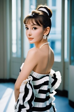 (masterpiece, best quality, hyper realistic, raw photo, ultra detailed, extremely detailed, intricately detailed), (photorealistic:1.4), (photography of Audrey Hepburn wearing a fashionable Striped off-the-shoulder ruffle hem dress, designed by Hubert de Givenchy, ), (smile), fairy, pure, innocent, beauty, (slender), super model, adr, Breakfast at Tiffany's, Sabrina, (glide_fashion), depth of field, (full shot), film grain, zeiss lens, symmetrical, 8k resolution,octane render (OC渲染), extremely high-resolution details, fine texture, dynamic angle,fashion (时尚), fashion,<lora:Breakfast at Tiffany's XL:0.8>,