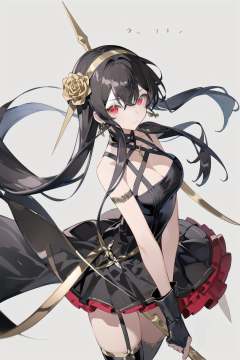 -siki, 1girl, yor briar, solo, breasts, dress, red eyes, hairband, black hair, black dress, weapon, gloves, gold hairband, holding, thighhighs, hair ornament, fingerless gloves, cleavage, flower, looking at viewer, holding weapon, black gloves, large breasts, jewelry, two-sided dress, earrings, two-sided fabric, bare shoulders, sidelocks, hair flower, simple background, black thighhighs, dagger, closed mouth, rose, long hair, bangs, white background, knife, cowboy shot, dual wielding, gold earrings, hair between eyes<lora:siki-000018:0.8>,
