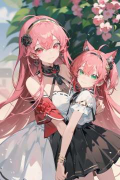 -siki, anya \(spy x family\), female child, multiple girls, yor briar, 2girls, jewelry, red eyes, white skirt, long hair, green eyes, child, shirt, pink hair, smile, looking at viewer, black hair, earrings, hairband, skirt, off shoulder, white hairband, off-shoulder shirt, bangs, v, closed mouth, blurry background, red shirt, eden academy school uniform, hair ornament, flower, bare shoulders, bracelet, gold earrings, hair flower, blurry, hair between eyes, dress, ahoge, short sleeves, school uniform<lora:siki-000018:0.8>,