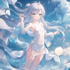 (masterpiece),illustration,(best quality),(painting),(backlighting:1.1),(Floating bubbles:1.3),(Beautiful Sky:1.15),cumulusm\(append\),(Girl:1.2),(looking at viewer:1.1),(full body),solo,(translucent body:1.15),expressionless,(light blue eyes:1.2),Delicate eyes,(flat chested:1.5),(Nipples:0.85),Standing position,(wet body:1.3),(pony-tail),messy hair,(thick hair:1.2),(very long hair:1.2),(Floating hair:1.2),long bangs,(Silver hair:1.2)(slime skin:1.2),(slime clothes:1.2),liquid skin,melting body,(White Puff Sleeve Dress:1.2),