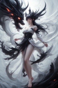 style of Karol Bak,the 1girl with white hanfu is standing in front of the black (chinese_dragon),bare legs,barefoot,dynamic pose,looking away,in the style of otherworldly beings,animecore,dark and menacing,intricate illustrations,delicate linework,fine details,whimsical patterns,enchanting scenes,dreamy visuals,captivating storytelling,gorecore,enigmatic characters,twisted characters,depth of field,floating,dynamic angle,long exposure,(motion blur):1.2,fluid movement,ethereal atmosphere,dreamy trails,dynamic energy,time-lapse effect,