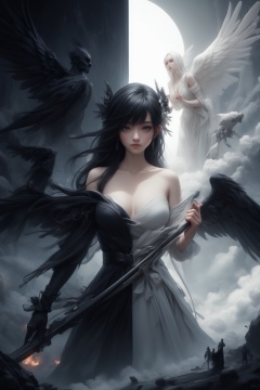 1girl,dark angel,holding the reaper scythe in hand,standing on a volcano,best quality,masterpiece,highres,(8k:0.9),beautiful and aesthetic,offical art,