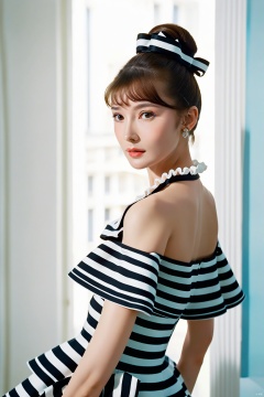 (masterpiece, best quality, hyper realistic, raw photo, ultra detailed, extremely detailed, intricately detailed), (photorealistic:1.4), (photography of Audrey Hepburn wearing a fashionable Striped off-the-shoulder ruffle hem dress, designed by Hubert de Givenchy, ), (smile), fairy, pure, innocent, beauty, (slender), super model, adr, Breakfast at Tiffany's, Sabrina, (glide_fashion), depth of field, (full shot), film grain, zeiss lens, symmetrical, 8k resolution,octanerender(OC渲染), extremely high-resolution details, fine texture, dynamicangle,fashion(时尚), fashion,,