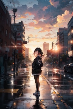 masterpiece,best quality,(ray tracing, cinematic lighting),ex-light,(central composition, Centered Composition and Symmetry:0.6),(back to camera:1.3),backlight,1girl,((solo)),black long hair,messy hair,jacket,pantyhose,rainy day,Cumulonimbus Cloud,(put hands in pockets),(outdoors, rain, sky, deserted streets, watered-down pavements, crossroad, fork in the road),tall buildings,bell towers,glass,reflections,streetlights,sunset,Tyndall Effect,