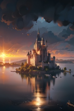 masterpiece,best quality,HD Resolution,(ray tracing,cinematic lighting),photography,Castle,Architecture,sea,sunburst,lighting,Clarity,Realism,Landscape Wallpaper,