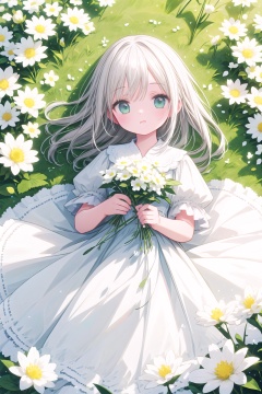 official art,8k wallpaper,ultra detailed,High quality,best quality),white flowers,1girl,from above,bird's-eye_view,vintage filter,among flowers,backlight,limited_palette,white,field s of flowers,