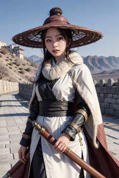1girl dress like move The Flying Swords of Dragon Gate, Ancient Chinese fortresses background, city walls, cape, desert, snow, furry_coat, furry_cloak, linen_clothes, bamboo_hat, masterpiece, best quality, 8k, photorealistic, <lora:Han_Ye_Seul_v3:1>
