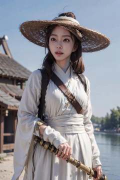 1girl dress like move The Flying Swords of Dragon Gate, white_linen_clothes, furry_caot, bamboo_hat, masterpiece, best quality, 8k, photorealistic,  <lora:Han_Ye_Seul_v3:1>
