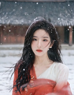cinematic photo ,Best quality , (masterpiece:1.2) , cinematic photo,1girl,A beautiful girl in red hanfu, Standing in the wind andsnow, long hair blown by the wind,snow in the sky , upperbody,snowing,snowy day,in winter ,motion blur ,(sad:1.1),(crying:1.1),close-up,(tears:1.1),(face focus:1.1),(close mouth:1.1),front view ,35mm photograph, film, bokeh, professional, 4k, highly detailed,helgirls
