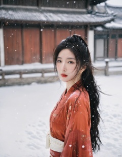 cinematic photo ,Best quality , (masterpiece:1.2) , cinematic photo,1girl,A beautiful girl in red hanfu, Standing in the wind andsnow, long hair blown by the wind,snow in the sky , upperbody,snowing,snowy day,in winter ,motion blur ,(sad:1.1),(crying:1.1),close-up,(tears:1.1),(face focus:1.1),(close mouth:1.1),front view ,35mm photograph, film, bokeh, professional, 4k, highly detailed,helgirls