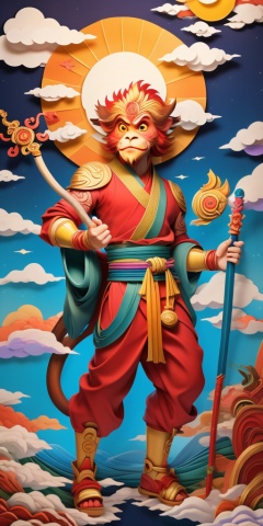 Sun Wukong holds the Ruyi Golden Hoop Stick treading a multicolored cloudLayered paper