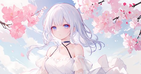 (masterpiece),illustration, best  quality, best refined rendering, extremely detailed, CG unity 8k wallpaper, sharp and clean edges, less noise, drawing as detailed and clear as possible, vivid and bright and colorful picture,1girl, solo, looking up, dress, long hair, blue eyes, choker, white hair, white dress, petals, white choker, flower, outdoors, arm up, parted lips, bare shoulders, off-shoulder dress, sky, pink flower, day, off shoulder, cherry blossoms, bangs, blurry, collarbone<lyco:GoodHands-beta2:1> <lora:PAseer的神话壁纸V1:0.3>