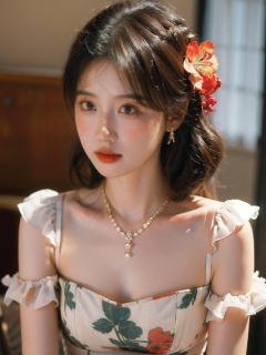 1girl,Kolak_blk,(8k, RAW photo, best quality, masterpiece:1.3),(realistic,photo-realistic:1.37),soft light,extremely beautiful face,an extremely delicate and beautiful girl,depth of field,blurry background,delicate,beautiful,beautiful face,beautiful eyes,beautiful girl,delicate face,delicate girl,8k wallpaper,(best quality:1.12),(detailed:1.12),(intricate:1.12),(ultra-detailed:1.12),(highres:1.12),hyper detailed,ultra-detailed,high resolution illustration,colorful,8k wallpaper,highres,Cinematic light,ray tracing,(8k, RAW photo, best quality, masterpiece, ultra highres, ultra detailed:1.2),(realistic, photo-realistic:),jewelry,ring,solo,necklace,flower,hair ornament,lips,blurry,realistic,grapes,hair flower,curly hair,blurry background,black hair,earrings,breasts,brown hair,red lips,applying_makeup,lipstick,(floral print:1.2),indoors,dress,(white dress:1.1),fluffy hair,cowboy_shot,