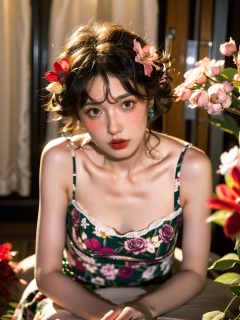 1girl,Kolak_blk,(8k, RAW photo, best quality, masterpiece:1.3),(realistic,photo-realistic:1.37),soft light,extremely beautiful face,an extremely delicate and beautiful girl,depth of field,blurry background,delicate,beautiful,beautiful face,beautiful eyes,beautiful girl,delicate face,delicate girl,8k wallpaper,(best quality:1.12),(detailed:1.12),(intricate:1.12),(ultra-detailed:1.12),(highres:1.12),hyper detailed,ultra-detailed,high resolution illustration,colorful,8k wallpaper,highres,Cinematic light,ray tracing,(8k, RAW photo, best quality, masterpiece, ultra highres, ultra detailed:1.2),(realistic, photo-realistic:),jewelry,ring,solo,necklace,flower,hair ornament,lips,blurry,realistic,grapes,hair flower,curly hair,blurry background,black hair,earrings,breasts,brown hair,red lips,applying_makeup,lipstick,(floral print:1.2),indoors,dress,(white dress:1.1),fluffy hair,cowboy_shot,freckle