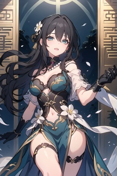 masterpiece,best quality,detialed,ruanmei,ruanmei_official,chinese dress,breasts,long hair,hair between eyes,black hair,bangs,medium breasts,cleavage,hair ornament,thigh strap,white flower,beads,gloves,jewelry,flower,dress,earrings,bare shoulders,blue dress,hair intakes,ruby necklace,black choker,green eyes,blue eyes,<lora:阮梅-0.8-逐辰十七:0.8>,1girl,valley,high contrast,Female orgasm,between thighs,church,cloud,