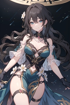 masterpiece,best quality,detialed,ruanmei,ruanmei_official,chinese dress,breasts,long hair,hair between eyes,black hair,bangs,medium breasts,cleavage,hair ornament,thigh strap,white flower,beads,gloves,jewelry,flower,dress,earrings,bare shoulders,blue dress,hair intakes,ruby necklace,black choker,green eyes,blue eyes,<lora:阮梅-0.8-逐辰十七:0.8>,1girl,magic circle,1980s,Smirk,female pov,palafitte,starry sky,