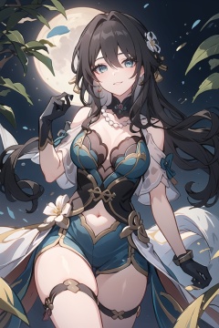 masterpiece,best quality,detialed,ruanmei,ruanmei_official,chinese dress,breasts,long hair,hair between eyes,black hair,bangs,medium breasts,cleavage,hair ornament,thigh strap,white flower,beads,gloves,jewelry,flower,dress,earrings,bare shoulders,blue dress,hair intakes,ruby necklace,black choker,green eyes,blue eyes,<lora:阮梅-0.8-逐辰十七:0.8>,1girl,by the moon,contour deepening,Smile,upshorts,cityspace,moonlight,
