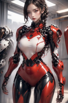 (Masterpiece: 1.6, (highly detailed: 1.6), (best quality: 1.6) (high resolution: 1.6) 1 girl, red patent leather Skin-tight garment, (mechanical: 1.1), complex decoration, armed weapons, Futurism, punk,machinery,blue_jijiaS,Sexy muscular, Hyung Tae Kim, mecha, circular face