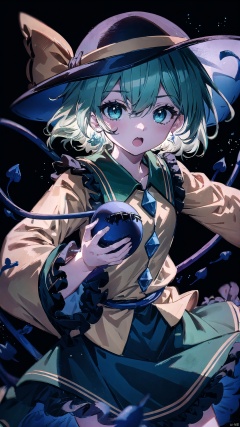 1girl, komeiji_koishi, solo, looking_at_viewer, short_hair, bangs, upper_body, hat bow,green hair,green eyes,symbol-shaped pupils,yellow shirt,green skirt,third eye,long sleeves, wide sleeves, floral print, eyeball, hair_over_one_eye, blood, buttons, floating_hair, rose, plant, black_background, blouse, red_flower, red_rose, heart_hair_ornament, vines, thorns, heart_button, backlight, komeiji koishi