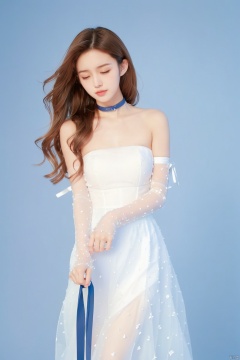 jy, 1girl, solo, dress, brown hair, white dress, closed eyes, long hair, bare shoulders, strapless, blue background, ribbon, strapless dress, holding, simple background, closed mouth, detached sleeves, choker, standing, lips
