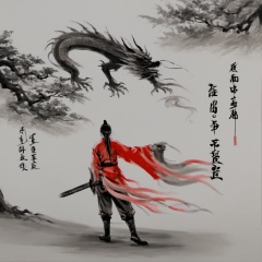 <lora:ink_xiakexing_xl:0.8>,1girl,red dress,dragon,ink painting,tree,ink painting,a drawing of a person with a long hair and a sword in his hand and a chinese writing on the wall,solo,1boy,hat,holding,standing,monochrome,weapon,greyscale,male focus,boots,sword,grey background,from behind,holding weapon,holding sword,letterboxed,topknot,long sleeves,ponytail,japanese clothes,katana,walking,chinese text,facing away,