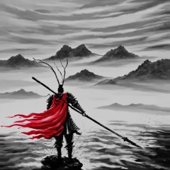 <lora:ink_xiakexing_xl_v1:0.8>,tree,mountains,ink painting,a painting of a man with a sword and a red cape standing in the water with a cloudy sky behind him,solo,1boy,holding,standing,weapon,male focus,from behind,cape,holding weapon,armor,helmet,polearm,spot color,spear,red cape,holding polearm,weapon over shoulder,floating cape,sword,katana,
