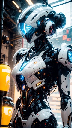 robot,blurry,Mecha,Full mecha,Upper body, blurry background, cable, depth of field,Streamlined mecha, glowing,Luminous mecha,Complex mechanical structures,Non humanoid head features,One eyed like a camera lens,Glowing Cyclops,White and black mecha,Multi light source mecha, glowing eyes, lights, machinery, mecha, power armor, robot, robot joints, science fiction, solo, Robot