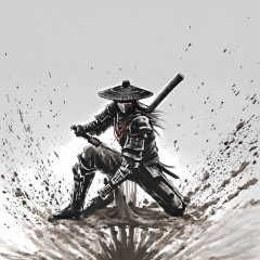 <lora:ink_xiakexing_xl_v1:0.8>,tree,mountains,ink painting,a drawing of a person sitting on a motorcycle in the mud with a hat on their head and a cane in his hand,solo,long hair,1boy,hat,holding,monochrome,weapon,male focus,boots,sword,holding weapon,armor,gun,blood,mask,glowing,sheath,spot color,japanese armor,one knee,katana,letterboxed,fighting stance,ajirogasa,