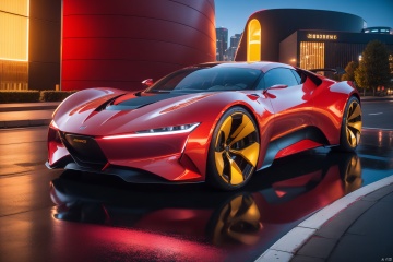 A futuristic car in a vibrant, metallic red hue speeds through the futuristic cityscape. The car's streamlined design and bold color make it a focal point amidst the sleek, modern architecture. The color temperature is warm, with a mix of red and orange tones casting a fiery glow over the city. The car's headlights emit a warm, golden light, adding to the futuristic and energetic atmosphere.,<lora:EMS-248008-EMS:0.800000>
