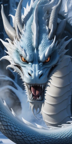 black border,(white ice eastern chinese dragon),head protruding border (spitting out steam:1.2),(eyes closely attached to the screen:1.2),huge chinese  eastern ice dragon face occupying full screen (spitting out steam:1.2),epic scenes,