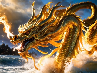 chinese golden eastern dragon,warlord,DCG,epic scenes,special effects,huge waves,realistic photo,ultimate light and shadow,cast a spell,