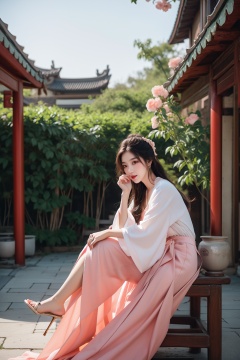 <lora:DT JL_20231017225505-000003:0.3>,ancient chinese courtyards,peach blossom,pink long skirt,illustrate dynamic hair,on_side,lean on side