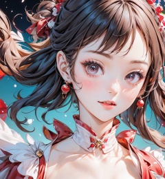 A charming illustration of a girl, radiating joy and excitement, at a Christmas party. The art form is reminiscent of a dynamic manga drawing, capturing the girl's playful and adorable expression. She wears a vibrant red Christmas costume, featuring a frilly dress adorned with bells and a star-shaped accessory in her hair. Surrounding her, colorful presents are stacked, adding to the festive atmosphere. The scene is set against a simple background, allowing the focus to be on the girl and her joyful presence. In a whimsical twist, she sits atop a large star, as if floating in the air, adding a touch of magic to the illustration. The overall result is a delightful depiction of a girl enjoying the holiday spirit with her friends, evoking a sense of warmth and happiness,upper body,