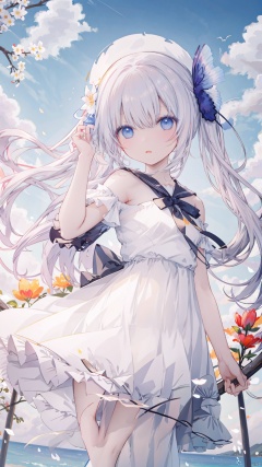 1girl, outdoors, solo, hat, dress, flower, tulip, blue eyes, long hair, white dress, looking at viewer, ribbon, pink flower, bangs, straw hat, day, sky, blush, hair ribbon, yellow flower, blue sky, red ribbon, bare shoulders, field, bow, twintails, petals, closed mouth, off shoulder, flower field, hair between eyes, tree, cloud, plaid, off-shoulder dress,silver hair, standing, hat bow, floating hair, arm up, wind, frills, low twintails, breasts,