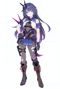 8k, best quality, masterpiece, (ultra-detailed:1.1), (high detailed skin), (full body:1.2), white background, standing, looking at viewer, solo, hand on hip, <lora:guikai-v100-000027:0.8:lbw=OUTALL>, guikai, raiden mei, 1girl, boots, purple hair, purple eyes, bangs, gloves, long hair, torn clothes, mask, (white background, simple background,:1.2), <lora:EnvyBetterHands LoCon_beta2 辅助:0.55>, ( good hands, nice hands:0.5), (beautiful_face), ((intricate_detail)), clear face, ((finely_detailed)), fine_fabric_emphasis, ((glossy)), full_shot