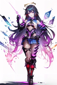 vaporwave, (Highest picture quality), (Master's work), (Detailed eye description), (8K wallpaper), (Detailed face description), (flat color:1.3), (ligne claire:1.3), (cover page:1.2), (movie poster:1.2), poster \(medium\), (solo:1.2), light painting, (long exposure):1.2, dynamic streaks, luminous trails, vibrant colors, fluid movement, captivating patterns, creative experimentation, [(white background:1.5)::5], (bottle bottom:0.9), mid shot, full body, [(black background:1.4)::20], [[bottle bottom]::0.5], (isometric:1.1), (multicolored_background:1.3), striped_background, card_background, 1girl, red lips, (red eyeshadow:1.2), full body, looking at viewer, beautiful detailed bright blue eyes, (beautiful detailed shiny red_hair:1.2), (seductive smile:1.2), mixed-, <lora:Gacha splash LORA v3:0.5>, <lora:guikai-v100-000027:0.8:lbw=OUTALL>, guikai, raiden mei, 1girl, boots, purple hair, purple eyes, bangs, gloves, long hair, torn clothes, mask, (full body:1), (detailed face:1), (one hand on hip:1.3), looking at you, empty hands, ///////////////////////////, psychedelic art, glitch art, abstract art, concept art, (point_color:1.4), (RGB Splitting:1.3), (god rays), (extremely detailed light), (science_fiction:1.2), (trippy:1.2), (colorful ink ), (floating colorful ink droplet ), (triangle shape:1.3), (Lilith of night:1.3), (gradient_background:1.1), (glitch background), ( digital halo:1.2), (fluorescent graffiti :1.2), (neon light:1.2), (glowstick:1.2), (floating triangle glass fragments:1.2)