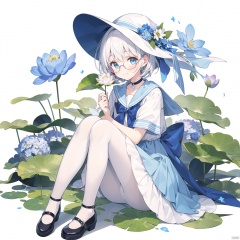 1girl,blue_bow,blue_choker,blue_flower,blue_ribbon,choker,daisy,dress,floral_background,flower,full_body,glasses,green_eyes,hat,holding,holding_flower,hydrangea,leaf,lily_\(flower\),lily_of_the_valley,lotus,morning_glory,plant,ribbon,sailor_collar,short_hair,short_sleeves,sitting,smile,solo,white_flower,white_headwear,white pantyhose,mary_janes,