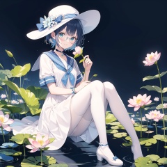 1girl,blue_bow,blue_choker,blue_flower,blue_ribbon,choker,copyright_name,daisy,dress,floral_background,flower,full_body,glasses,green_eyes,hat,holding,holding_flower,hydrangea,leaf,lily_\(flower\),lily_of_the_valley,lotus,morning_glory,plant,ribbon,sailor_collar,short_hair,short_sleeves,sitting,smile,solo,white_flower,white_headwear,white pantyhose,