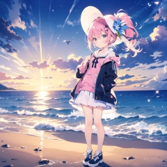 white background,solo,loli,Pink hair,Yellow eyes,high ponytail,beach,high ponytail,hair flower,frilled shirt collar,facula,spot,messy hair,fipped hair,floating hair,(petite),(loli),(solo),(open jacket),staring,blank stare,visor,towel,ribbon,sun hat,innertube,sail,(full body, wide shot, mid shot, panorama),blue sky,cloudy,